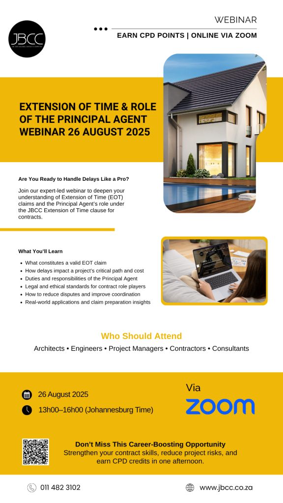 👉 Register now: https://jbcc.co.za/events/extension-of-time-and-role-of-the-principal-agent-webinar-26-august-2025/